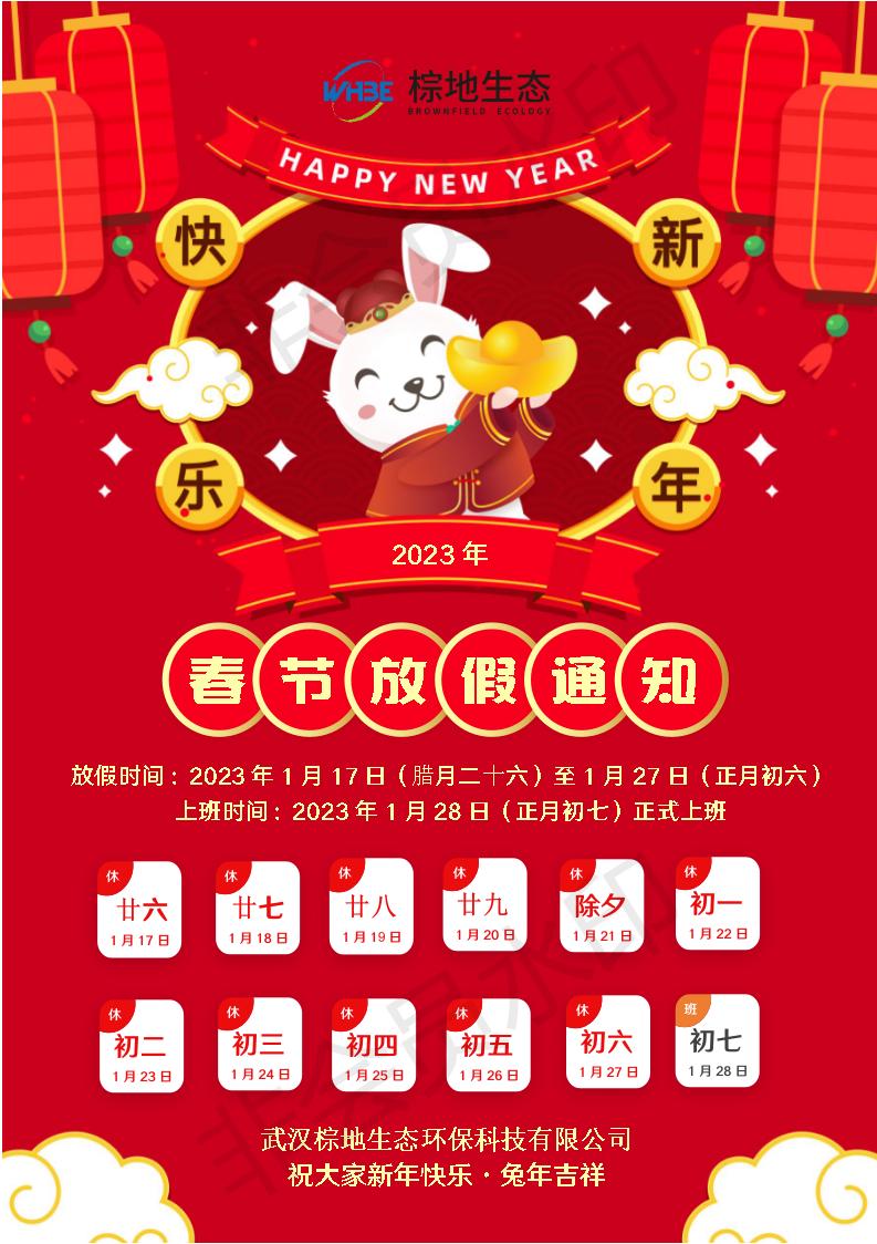 ? ? ? ? ?感謝您一直以來對我們工作的支持與理解,2023年新春將至,武漢棕地生態(tài)環(huán)保科技有限公司全體員工預(yù)祝大家新年快樂,兔年吉祥。