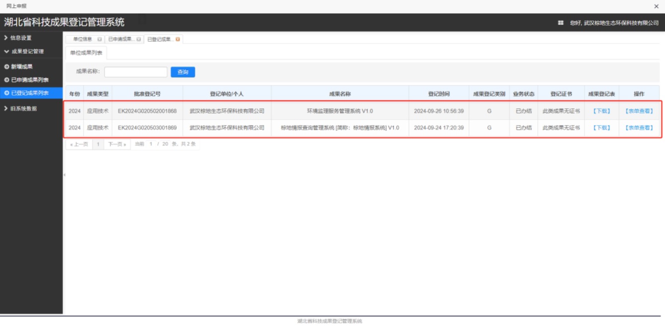 2024年9月24日至26日,我司在武漢市科學(xué)技術(shù)局對(duì)我司獨(dú)立研究的棕地情報(bào)查詢管理系統(tǒng)、環(huán)境監(jiān)理服務(wù)管理系統(tǒng)進(jìn)行了登記。